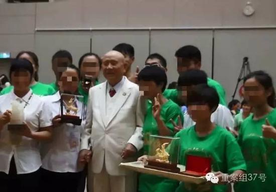 86岁的左坤着一身白色西装、拄着拐杖,被众信徒围坐在观众席的第一排。一段表演结束后,左坤在信徒的拥簇下走上前,坐在一张桌前讲起了话。